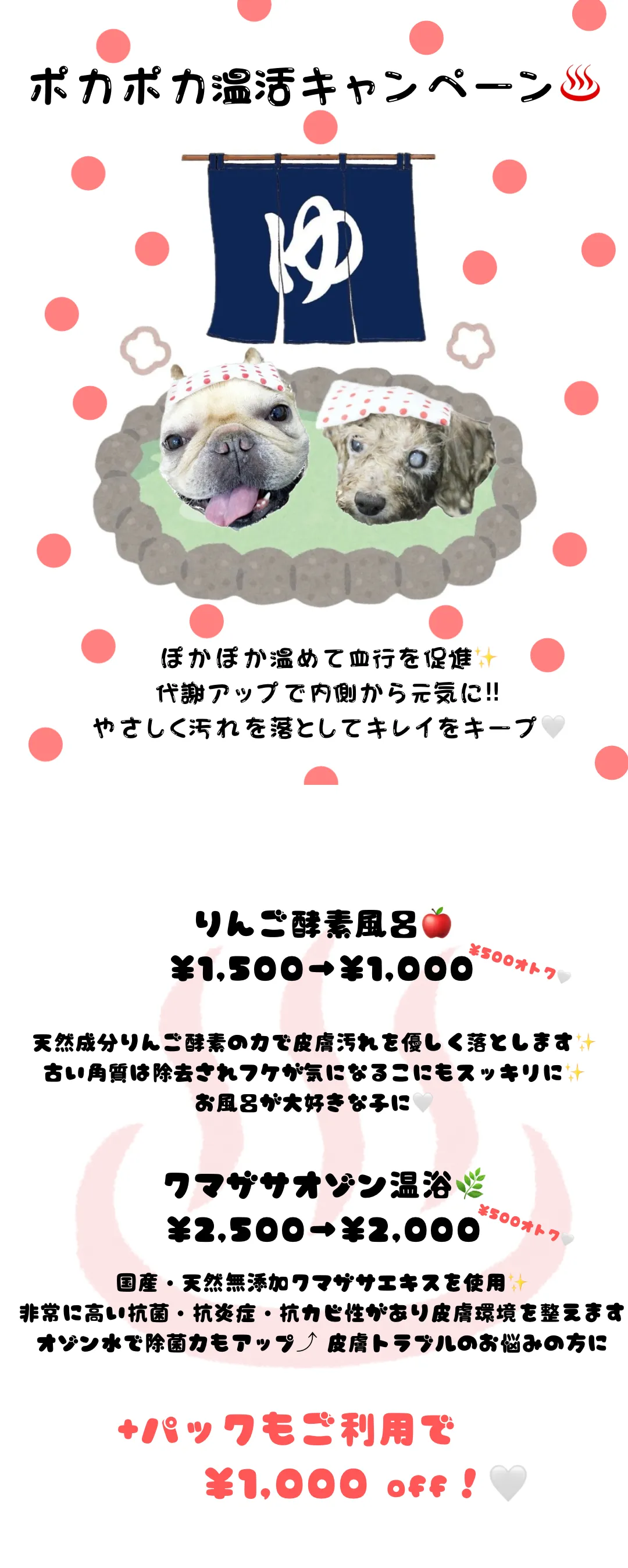 | うるもちPlus.りんご酵素風呂+ハーブパック+肉球ケア | ¥3,500 |